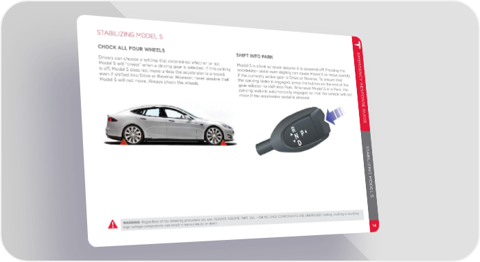 S T ABILIZING MODEL SSTABILIZING MODEL S EMERGENC CHOCK ALL FOUR WHEELS SHIFT INTO PARK Drivers can choose a setting that determines whether or not Model S is silent so never assume it is powered o . Pressing the Model S will “creep” when a driving gear is selected. If this setting accelerator pedal even slightly can cause Model S to move quickly is o , Model S does not move unless the accelerator is pressed, if the currently active gear is Drive or Reverse. To ensure that Y RESPONSE GUIDE even if shifted into Drive or Reverse. However, never assume that the parking brake is engaged, press the button on the end of the Model S will not move. Always chock the wheels. gear selector to shift into Park. Whenever Model S is in Park, the parking brake is automatically engaged so that the vehicle will not move if the accelerator pedal is pressed. S T ABILIZING MODEL S WARNING: Regardless of the disabling procedure you use, ALWAYS ASSUME THAT ALL HIGH VOLTAGE COMPONENTS ARE ENERGIZED! Cutting, crushing or touching high voltage components can result in serious injury or death. 14