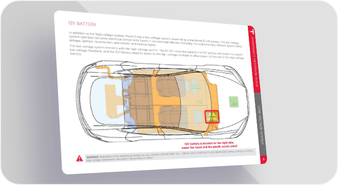 L O W V 12V BATTERY EMERGENC O L T A In addition to the high voltage system, Model S has a low voltage system, powered by a traditional 12 volt battery. The low voltage GE S system operates the same electrical components found in conventional vehicles, including the supplementary restraint system (SRS), airbags, ignition, touchscreen, and interior and exterior lights. Y Y RESPONSE GUIDE S The low voltage system interacts with the high voltage system. The DC-DC converter supplies the 12V battery with power to support TEM low voltage functions, and the 12V battery supplies power to the high voltage contacts to allow power to fl ow out of the high voltage battery. L O W V O L T A GE S Y S 12V battery is located on the right side, TEM under the hood and the plastic access panel WARNING: Regardless of the disabling procedure you use, ALWAYS ASSUME THAT ALL HIGH VOLTAGE COMPONENTS ARE ENERGIZED! Cutting, crushing or touching high voltage components can result in serious injury or death. 9