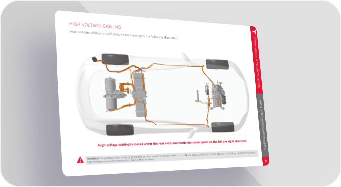 HIGH VOLTAGE CABLING EMERGENC High voltage cabling is highlighted in dark orange in the following illustration. Y RESPONSE GUIDE HIGH V O L T A GE C OMPONENT High voltage cabling is routed under the rear seats and inside the rocker panel on the left and right side front S WARNING: Regardless of the disabling procedure you use, ALWAYS ASSUME THAT ALL HIGH VOLTAGE COMPONENTS ARE ENERGIZED! Cutting, crushing or touching high voltage components can result in serious injury or death. 6