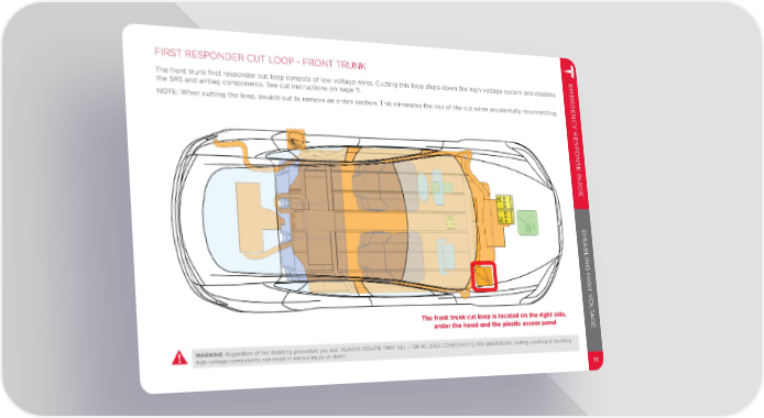 FIRST RESPONDER CUT LOOP - FRONT TRUNK EMERGENC The front trunk fi rst responder cut loop consists of low voltage wires. Cutting this loop shuts down the high voltage system and disables the SRS and airbag components. See cut instructions on page 11. NOTE: When cutting the loop, double cut to remove an entire section. This eliminates the risk of the cut wires accidentally reconnecting. Y RESPONSE GUIDE DIS ABLING HIGH V O L T The front trunk cut loop is located on the right side, A under the hood and the plastic access panel GE WARNING: Regardless of the disabling procedure you use, ALWAYS ASSUME THAT ALL HIGH VOLTAGE COMPONENTS ARE ENERGIZED! Cutting, crushing or touching high voltage components can result in serious injury or death. 11