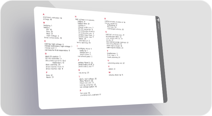 A H R INDEX aluminum, extruded 18 high voltage components reinforcements, location of 18 airbags 16 battery 4 rescue operations B battery fi res 21 fi refi ghting 21 cabling 6 fl oor pan 20 badging 1 charge controllers 7 submerged vehicles 20 battery DC-DC converter 5 S 12V 10 drive inverter, front 8 fi res 21 drive inverter, rear 9 seat belt pre-tensioners 17 fl uid 21 junction box, front 5 second responders 21 high voltage 4 junction box, rear 7 side-resting vehicles 22 body components 18 labels 25 smoke 21 overview of 3 stabilization points (jacking) 22 C hood, opening 24 stabilizing Model S 15 cabling, high voltage 6 I steel, high strength 18 charge controllers, high voltage 7 submerged vehicles 20 charge port 2 identifying Model S T cut loop for fi rst responders 11 badging 1 charge port 2 touchscreen 2 D large screen 2 toxic vapors 21 dash lift caution 5 instrument panel 2 trunk, opening 24 DC-DC converter 5 J U disconnect point for fi rst responders 13 jacking Model S 22 unlocking, using key 23 door, opening 23 junction box, front 5 drive inverter, front 8 junction box, rear 7 V drive inverter, rear 9 K vapors 21 F key, using 23 W fi res 21 L wheels, chocking 15 fl uids 21 labels, high voltage 25 lifting Model S 22 lithium-ion cells 21 locking, using key 23 low voltage system 10 P Park gear 15 pre-tensioners, seat belt 17