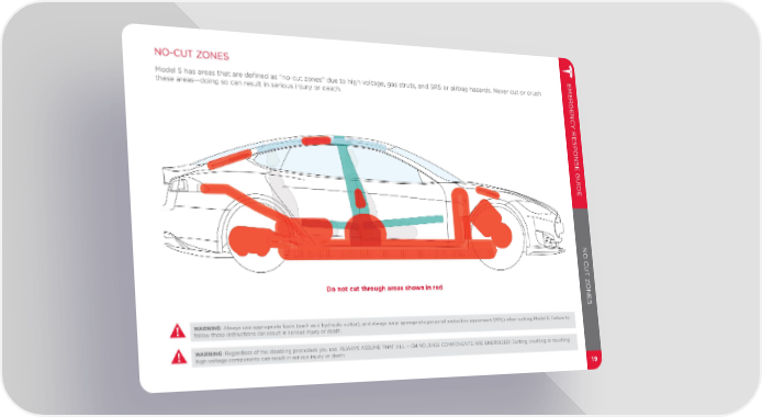 NO-CUT ZONES EMERGENC Model S has areas that are defi ned as “no-cut zones” due to high voltage, gas struts, and SRS or airbag hazards. Never cut or crush these areas—doing so can result in serious injury or death. Y RESPONSE GUIDE NO CUT Z Do not cut through areas shown in red ONES WARNING: Always use appropriate tools (such as a hydraulic cutter), and always wear appropriate personal protective equipment (PPE) when cutting Model S. Failure to follow these instructions can result in serious injury or death. WARNING: Regardless of the disabling procedure you use, ALWAYS ASSUME THAT ALL HIGH VOLTAGE COMPONENTS ARE ENERGIZED! Cutting, crushing or touching high voltage components can result in serious injury or death. 19