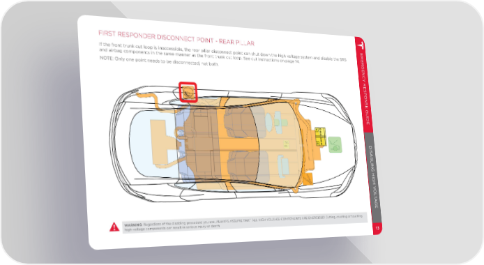 FIRST RESPONDER DISCONNECT POINT - REAR PILLAR EMERGENC If the front trunk cut loop is inaccessible, the rear pillar disconnect point can shut down the high voltage system and disable the SRS and airbag components in the same manner as the front trunk cut loop. See cut instructions on page 14. NOTE: Only one point needs to be disconnected, not both. Y RESPONSE GUIDE DIS ABLING HIGH V O L T A GE WARNING: Regardless of the disabling procedure you use, ALWAYS ASSUME THAT ALL HIGH VOLTAGE COMPONENTS ARE ENERGIZED! Cutting, crushing or touching high voltage components can result in serious injury or death. 13