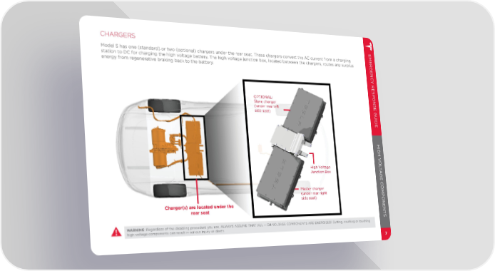 CHARGERS EMERGENC Model S has one (standard) or two (optional) chargers under the rear seat. These chargers convert the AC current from a charging station to DC for charging the high voltage battery. The high voltage junction box, located between the chargers, routes any surplus energy from regenerative braking back to the battery. Y RESPONSE GUIDE OPTIONAL: Slave charger (under rear left side seat) HIGH V O L High Voltage T Junction Box A GE C Master charger OMPONENT (under rear right side seat) Charger(s) are located under the rear seat S WARNING: Regardless of the disabling procedure you use, ALWAYS ASSUME THAT ALL HIGH VOLTAGE COMPONENTS ARE ENERGIZED! Cutting, crushing or touching high voltage components can result in serious injury or death. 7