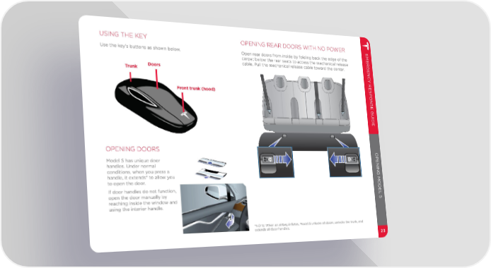 USING THE KEY OPENING REAR DOORS WITH NO POWER EMERGENC Use the key’s buttons as shown below. Open rear doors from inside by folding back the edge of the carpet below the rear seats to access the mechanical release cable. Pull the mechanical release cable toward the center. Trunk Doors Y RESPONSE GUIDE Front trunk (hood) OPENING DOORS OPENING MODEL S Model S has unique door handles. Under normal conditions, when you press a handle, it extends* to allow you to open the door. If door handles do not function, open the door manually by reaching inside the window and using the interior handle. *NOTE: When an airbag infl ates, Model S unlocks all doors, unlocks the trunk, and extends all door handles. 23