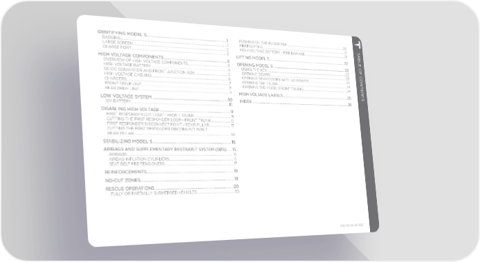 IDENTIFYING MODEL S ...................................................................................1 PUSHING ON THE FLOOR PAN .................................................................................. 20 FIREFIGHTING .......................................................................................................................21 T BADGING.....................................................................................................................................1 HIGH VOLTAGE BATTERY - FIRE DAMAGE ...........................................................21 ABLE OF C LARGE SCREEN ..................................................................................................................... 2 CHARGE PORT ....................................................................................................................... 2 LIFTING MODEL S ......................................................................................... 22 HIGH VOLTAGE COMPONENTS ..................................................................3 OPENING MODEL S ...................................................................................... 23 OVERVIEW OF HIGH VOLTAGE COMPONENTS...................................................3 USING THE KEY ...................................................................................................................23 HIGH VOLTAGE BATTERY ................................................................................................4 DC-DC CONVERTER AND FRONT JUNCTION BOX ...........................................5 OPENING DOORS ...............................................................................................................23 ONTENT HIGH VOLTAGE CABLING ................................................................................................. 6 OPENING REAR DOORS WITH NO POWER .........................................................23 CHARGERS ................................................................................................................................7 OPENING THE TRUNK......................................................................................................24 FRONT DRIVE UNIT ............................................................................................................. 8 OPENING THE HOOD (FRONT TRUNK) .................................................................24 REAR DRIVE UNIT ................................................................................................................9 HIGH VOLTAGE LABELS ............................................................................. 25 S LOW VOLTAGE SYSTEM ..............................................................................10 INDEX ................................................................................................................. 26 12V BATTERY..........................................................................................................................10 DISABLING HIGH VOLTAGE......................................................................... 11 FIRST RESPONDER CUT LOOP - FRONT TRUNK ...............................................11 CUTTING THE FIRST RESPONDER LOOP - FRONT TRUNK .........................12 FIRST RESPONDER DISCONNECT POINT - REAR PILLAR ............................13 CUTTING THE FIRST RESPONDER DISCONNECT POINT - REAR PILLAR .........................................................................................................................14 STABILIZING MODEL S ................................................................................. 15 AIRBAGS AND SUPPLEMENTARY RESTRAINT SYSTEM (SRS) .....16 AIRBAGS ...................................................................................................................................16 AIRBAG INFLATION CYLINDERS .................................................................................16 SEAT BELT PRE-TENSIONERS ......................................................................................17 REINFORCEMENTS ........................................................................................ 18 NO-CUT ZONES...............................................................................................19 RESCUE OPERATIONS ................................................................................20 FULLY OR PARTIALLY SUBMERGED VEHICLES ...............................................20 P/N: SC-15-94-002