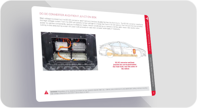 DC-DC CONVERTER AND FRONT JUNCTION BOX EMERGENC High voltage is present at the DC-DC converter and front junction box, located behind the front trunk. The DC-DC converter transforms the high voltage current from the 400 volt battery to low voltage to charge the Model S 12 volt battery. The front junction box provides power to various components, such as the Battery heater, the air conditioning compressor and the cabin heater. Use caution when cutting in this area during a dash lift (dash roll) procedure—use work-around techniques, if necessary. Y RESPONSE GUIDE HIGH V DC-DC converter and front junction box are located behind O L the front trunk, near the center of T the vehicle A GE C OMPONENT S WARNING: Regardless of the disabling procedure you use, ALWAYS ASSUME THAT ALL HIGH VOLTAGE COMPONENTS ARE ENERGIZED! Cutting, crushing or touching high voltage components can result in serious injury or death. 5