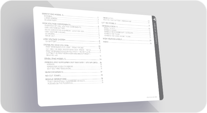 IDENTIFYING MODEL S ...................................................................................1 FIREFIGHTING ..................................................................................................................... 20 HIGH VOLTAGE BATTERY - FIRE DAMAGE ......................................................... 20 T BADGING.....................................................................................................................................1 ABLE OF C LARGE SCREEN ..................................................................................................................... 2 LIFTING MODEL S .......................................................................................... 21 CHARGE PORT ....................................................................................................................... 2 HIGH VOLTAGE COMPONENTS ..................................................................3 OPENING MODEL S ...................................................................................... 22 OVERVIEW OF HIGH VOLTAGE COMPONENTS...................................................3 USING THE KEY ...................................................................................................................22 HIGH VOLTAGE BATTERY ................................................................................................4 OPENING DOORS ...............................................................................................................22 DC-DC CONVERTER AND FRONT JUNCTION BOX ...........................................5 OPENING REAR DOORS WITH NO POWER .........................................................22 ONTENT HIGH VOLTAGE CABLING ................................................................................................. 6 OPENING THE TRUNK......................................................................................................23 CHARGERS ................................................................................................................................7 OPENING THE HOOD (FRONT TRUNK) .................................................................23 DRIVE UNIT .............................................................................................................................. 8 HIGH VOLTAGE LABELS .............................................................................24 LOW VOLTAGE SYSTEM ................................................................................9 INDEX ................................................................................................................. 25 S 12V BATTERY........................................................................................................................... 9 DISABLING HIGH VOLTAGE........................................................................10 FIRST RESPONDER CUT LOOP - FRONT TRUNK ..............................................10 CUTTING THE FIRST RESPONDER LOOP - FRONT TRUNK ..........................11 FIRST RESPONDER DISCONNECT POINT - REAR PILLAR ............................12 CUTTING THE FIRST RESPONDER DISCONNECT POINT - REAR PILLAR .........................................................................................................................13 STABILIZING MODEL S .................................................................................14 AIRBAGS AND SUPPLEMENTARY RESTRAINT SYSTEM (SRS) .....15 AIRBAGS ...................................................................................................................................15 AIRBAG INFLATION CYLINDERS .................................................................................15 SEAT BELT PRE-TENSIONERS ......................................................................................16 REINFORCEMENTS ........................................................................................ 17 NO-CUT ZONES............................................................................................... 18 RESCUE OPERATIONS .................................................................................19 FULLY OR PARTIALLY SUBMERGED VEHICLES .................................................19 PUSHING ON THE FLOOR PAN ....................................................................................19 P/N: SC-14-94-001.1