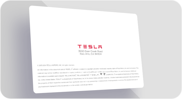 3500 Deer Creek Road Palo Alto, CA 94304 © 2013-2014 TESLA MOTORS, INC. All rights reserved. ® All information in this document and all MODEL S software is subject to copyright and other intellectual property rights of Tesla Motors, Inc. and its licensors. This material may not be modifi ed, reproduced or copied, in whole or in part, without the prior written permission of Tesla Motors, Inc. and its licensors. Additional ® ® ® ® ® ® information is available upon request. TESLA MOTORS , TESLA ROADSTER , , , , and MODEL S are registered trademarks of Tesla Motors, Inc. in the United States. TESLA™ is a trademark of Tesla Motors, Inc. in the United States and other countries. All other trademarks contained in this document are the property of their respective owners and their use herein does not imply sponsorship or endorsement of their products or services. The unauthorized use of any trademark displayed in this document or on the vehicle is strictly prohibited.