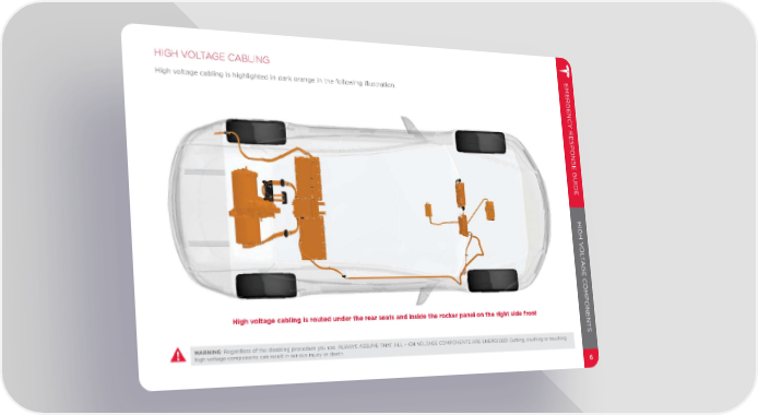 HIGH VOLTAGE CABLING EMERGENC High voltage cabling is highlighted in dark orange in the following illustration. Y RESPONSE GUIDE HIGH V O L T A GE C OMPONENT High voltage cabling is routed under the rear seats and inside the rocker panel on the right side front S WARNING: Regardless of the disabling procedure you use, ALWAYS ASSUME THAT ALL HIGH VOLTAGE COMPONENTS ARE ENERGIZED! Cutting, crushing or touching high voltage components can result in serious injury or death. 6