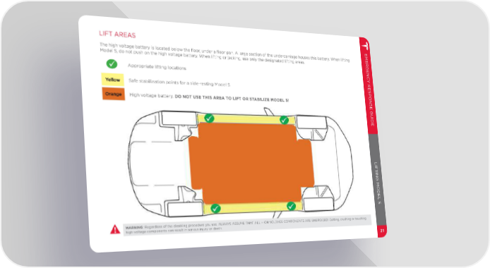LIFTING MODEL S LIFT AREAS EMERGENC The high voltage battery is located below the fl oor, under a fl oor pan. A large section of the undercarriage houses this battery. When lifting Model S, do not push on the high voltage battery. When lifting or jacking, use only the designated lifting areas. Appropriate lifting locations Y RESPONSE GUIDE Yellow Safe stabilization points for a side-resting Model S Orange High voltage battery. DO NOT USE THIS AREA TO LIFT OR STABILIZE MODEL S! LIFTING MODEL S WARNING: Regardless of the disabling procedure you use, ALWAYS ASSUME THAT ALL HIGH VOLTAGE COMPONENTS ARE ENERGIZED! Cutting, crushing or touching high voltage components can result in serious injury or death. 21
