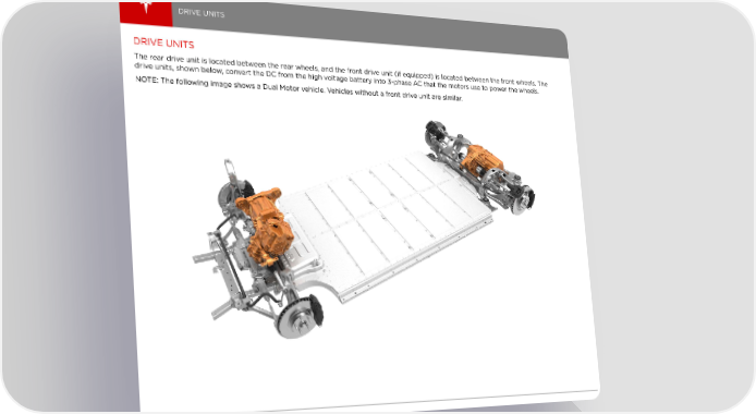 DRIVE UNITS DRIVE UNITS The rear drive unit is located between the rear wheels, and the front drive unit (if equipped) is located between the front wheels. The drive units, shown below, convert the DC from the high voltage battery into 3-phase AC that the motors use to power the wheels. NOTE: The following image shows a Dual Motor vehicle. Vehicles without a front drive unit are similar. 10