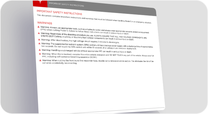 IMPORTANT SAFETY INSTRUCTIONS IMPORTANT SAFETY INSTRUCTIONS This document contains important instructions and warnings that must be followed when handling Model S in an emergency situation. WARNINGS Warning: Always use appropriate tools, such as a hydraulic cutter, and always wear appropriate personal protective equipment (PPE) when cutting Model S. Failure to follow these instructions can result in serious injury or death. Warning: Regardless of the disabling procedure you use, ALWAYS ASSUME THAT ALL HIGH VOLTAGE COMPONENTS ARE ENERGIZED! Cutting, crushing, or touching high voltage components can result in serious injury or death. Warning: After deactivation, the high voltage circuit requires 2 minutes to de-energize. Warning: The supplemental restraint system (SRS) control unit has a backup power supply with a discharge time of approximately ten seconds. Do not touch the SRS control unit within 10 seconds of an airbag or pre-tensioner deployment. Warning: Handling a submerged vehicle without appropriate PPE can result in serious injury or death. Warning: When fire is involved, consider the entire vehicle energized and DO NOT TOUCH any part of the vehicle. Always wear full PPE, including self-contained breathing apparatus (SCBA). Warning: When cutting the front trunk first responder loop, double cut to remove an entire section. This eliminates the risk of the cut wires accidentally reconnecting. 2