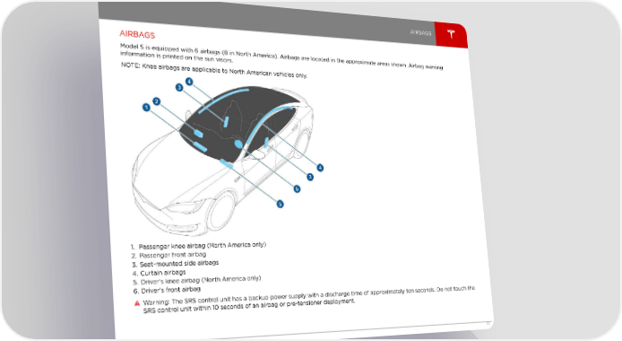 AIRBAGS AIRBAGS Model S is equipped with 6 airbags (8 in North America). Airbags are located in the approximate areas shown. Airbag warning information is printed on the sun visors. NOTE: Knee airbags are applicable to North American vehicles only. 1. Passenger knee airbag (North America only) 2. Passenger front airbag 3. Seat-mounted side airbags 4. Curtain airbags 5. Driver's knee airbag (North America only) 6. Driver's front airbag Warning: The SRS control unit has a backup power supply with a discharge time of approximately ten seconds. Do not touch the SRS control unit within 10 seconds of an airbag or pre-tensioner deployment. Airbags and Components 15