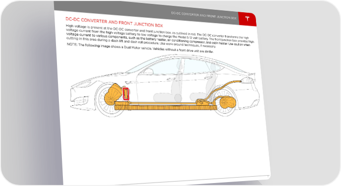 DC-DC CONVERTER AND FRONT JUNCTION BOX DC-DC CONVERTER AND FRONT JUNCTION BOX High voltage is present at the DC-DC converter and front junction box, as outlined in red. The DC-DC converter transforms the high voltage current from the high voltage battery to low voltage to charge the Model S 12 volt battery. The front junction box provides high voltage current to various components, such as the battery heater, air conditioning compressor, and cabin heater. Use caution when cutting in this area during a dash lift and dash roll procedure. Use work-around techniques, if necessary. NOTE: The following image shows a Dual Motor vehicle. Vehicles without a front drive unit are similar. Electric Vehicle Components 7