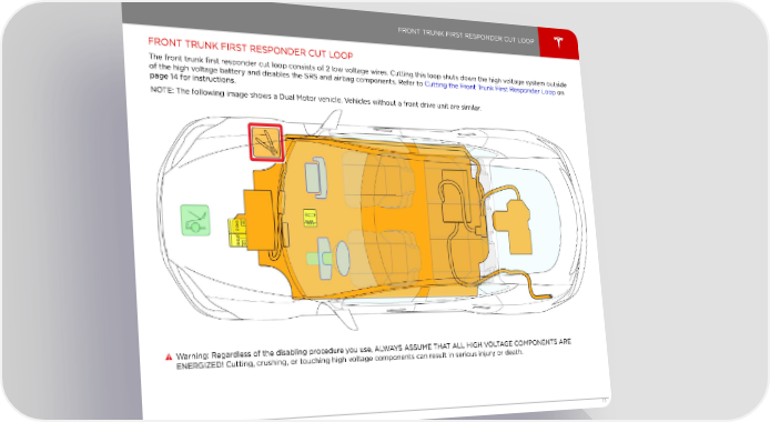 FRONT TRUNK FIRST RESPONDER CUT LOOP FRONT TRUNK FIRST RESPONDER CUT LOOP The front trunk first responder cut loop consists of 2 low voltage wires. Cutting this loop shuts down the high voltage system outside of the high voltage battery and disables the SRS and airbag components. Refer to Cutting the Front Trunk First Responder Loop on page 14 for instructions. NOTE: The following image shows a Dual Motor vehicle. Vehicles without a front drive unit are similar. Warning: Regardless of the disabling procedure you use, ALWAYS ASSUME THAT ALL HIGH VOLTAGE COMPONENTS ARE ENERGIZED! Cutting, crushing, or touching high voltage components can result in serious injury or death. Disabling the High Voltage System 13