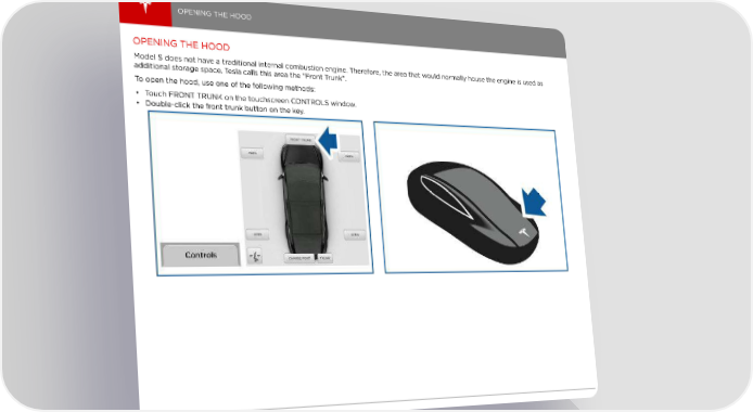 OPENING THE HOOD OPENING THE HOOD Model S does not have a traditional internal combustion engine. Therefore, the area that would normally house the engine is used as additional storage space. Tesla calls this area the “Front Trunk”. To open the hood, use one of the following methods: • Touch FRONT TRUNK on the touchscreen CONTROLS window. • Double-click the front trunk button on the key. 24
