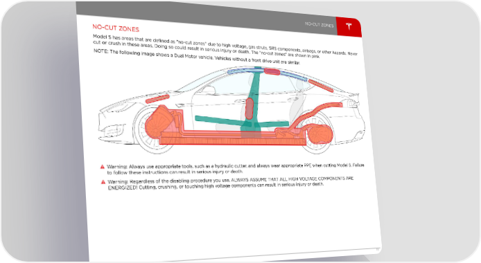 NO-CUT ZONES NO-CUT ZONES Model S has areas that are defined as "no-cut zones" due to high voltage, gas struts, SRS components, airbags, or other hazards. Never cut or crush in these areas. Doing so could result in serious injury or death. The "no-cut zones" are shown in pink. NOTE: The following image shows a Dual Motor vehicle. Vehicles without a front drive unit are similar. Warning: Always use appropriate tools, such as a hydraulic cutter, and always wear appropriate PPE when cutting Model S. Failure to follow these instructions can result in serious injury or death. Warning: Regardless of the disabling procedure you use, ALWAYS ASSUME THAT ALL HIGH VOLTAGE COMPONENTS ARE ENERGIZED! Cutting, crushing, or touching high voltage components can result in serious injury or death. Reinforcements 19