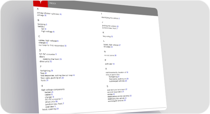 INDEX A I airbag inflation cylinders 16 identifying the vehicle 3 airbags 15 J B jacking the vehicle 22 badging 3 junction box, front 7 battery 12V 11 K high voltage 6 key, using 23 C cables, high voltage 8 L charger 9 labels, high voltage 27 cut loop for first responders 13 lift areas 22 D N DC-DC converter 7 no cut zones 19 doors opening the front 23 P drive units 10 park gear 12 F R firefighting 21 fires 21 reinforcements, location of 18 first responder, cutting the cut loop 14 rescue operations floor pans, pushing on 20 firefighting 21 fluids 21 floor pans, pushing on 20 submerged vehicles 20 H S high voltage components battery 6 seat belt pre-tensioners 17 cables 8 second responders 21 charger 9 smoke 21 DC-DC converter 7 stabilization points (jacking) 22 drive units 10 stabilizing the vehicle 12 junction box, front 7 submerged vehicles 20 overview 5 hood, opening 24 28