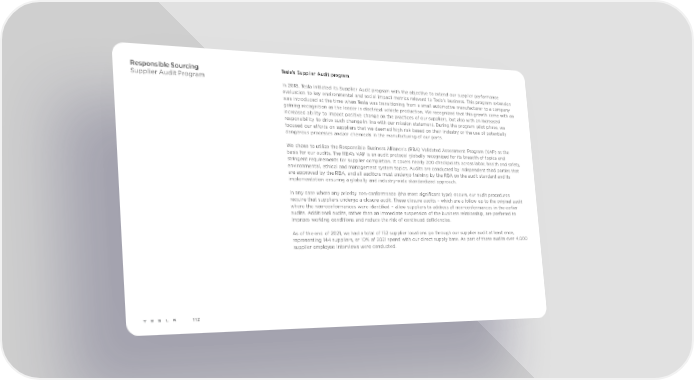 Responsible Sourcing Tesla’s Supplier Audit program Supplier Audit Program In 2018, Tesla initiated its Supplier Audit program with the objective to extend our supplier performance evaluation to key environmental and social impact metrics relevant to Tesla’s business. This program extension was introduced at the time when Tesla was transitioning from a small automotive manufacturer to a company gaining recognition as the leader in electrical vehicle production. We recognized that this growth came with an increased ability to impact positive change on the practices of our suppliers, but also with an increased responsibility to drive such change in line with our mission statement. During the program pilot phase, we focused our efforts on suppliers that we deemed high risk based on their industry or the use of potentially dangerous processes and/or chemicals in the manufacturing of our parts. We chose to utilize the Responsible Business Alliance’s (RBA) Validated Assessment Program (VAP) as the basis for our audits. The RBA’s VAP is an audit protocol globally recognized for its breadth of topics and stringent requirements for supplier completion. It covers nearly 200 checkpoints across labor, health and safety, environmental, ethical and management system topics. Audits are conducted by independent third parties that are approved by the RBA, and all auditors must undergo training by the RBA on the audit standard and its implementation ensuring a globally and industry-wide standardized approach. In any case where any priority non-conformance (the most significant type) occurs, our audit procedures require that suppliers undergo a closure audit. These closure audits – which are a follow up to the original audit where the non-conformances were identified – allow suppliers to address all non-conformances in the earlier audits. Additional audits, rather than an immediate suspension of the business relationship, are preferred to improve working conditions and reduce the risk of continued deficiencies. As of the end of 2021, we had a total of 152 supplier locations go through our supplier audit at least once, representing 144 suppliers, or 10% of 2021 spend with our direct supply base. As part of these audits over 4,000 supplier employee interviews were conducted. 112