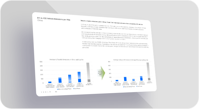 EV vs. ICE Vehicle Emissions per Mile Despite a higher-emissions grid in China, Model 3 still has lower emissions than comparable ICE vehicles China In China, much of the grid is powered by coal. That said, even in this scenario, charging a Tesla Model 3Y from the grid is still less emission intensive than running an ICE vehicle. Just like in Europe, we have assumed a vehicle lifetime of 150,000 miles. We are expecting the grid mix in China to improve dramatically over time as China remains a dominant deployer and manufacturer of renewable energy. Sichuan Province (with a population of 81 million) is a great example of this. In this province, given the high percentage of renewable energy penetration, charging an EV from the grid is less polluting than charging an EV in most global countries or states. In conclusion, even as of 2021, charging a Tesla Model 3Y in any of our major markets is more environmentally friendly than burning gasoline. Considering that vehicles are used for 17 to 20 years before getting scrapped, it is reasonable to assume that in the coming years, the gap in emissions per mile between EVs and ICEs will only get wider. Average Lifecycle Emissions in China (gCO e/mi) Average Lifecycle Emissions in Sichuan Province (gCO e/mi) 2 2 500 500 400 400 300 300 Shift to 200 greener 200 grid 100 100 0 0 Model 3Y Model 3Y Model 3Y Model 3Y Average Model 3Y Model 3Y Model 3Y Model 3Y Average Ridesharing Use Personal Use Ridesharing Use Personal Use Premium ICE Ridesharing Use Personal Use Ridesharing Use Personal Use Premium ICE (solar charged) (solar charged) (grid charged) (grid charged) (solar charged) (solar charged) (grid charged) (grid charged) Manufacturing Phase Use Phase Manufacturing Phase Use Phase 62