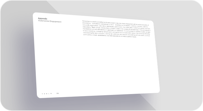 Appendix Managing a successful and effective Impact program requires robust engagement with an entire ecosystem of Stakeholder Engagement stakeholders – both internal and external to Tesla – including our employees, customers, investors, suppliers, non-profit organizations, educational institutions, governments, the communities in which we operate and trade associations. These groups, among others, all have a stake in the success of our businesses — they are people or organizations who are affected by or can impact our operations. For our business to continue to grow, we need to keep innovating, developing new products and markets all in a sustainable manner. We do this by attracting and retaining the best employees, serving our customers and investors and working with non-profits, our local communities, schools, governments and trade associations to make a positive impact. 132