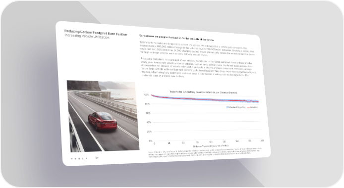 Reducing Carbon Footprint Even Further Our batteries are designed to function for the entire life of the vehicle Increasing Vehicle Utilization Tesla’s battery packs are designed to outlast the vehicle. We estimate that a vehicle gets scrapped after approximately 200,000 miles of usage in the U.S. and roughly 150,000 miles in Europe. Creating a battery that could last for 1,000,000 miles (4,000 charging cycles) would dramatically reduce the emissions per mile driven for high-mileage vehicles such as taxis, delivery vans or trucks. Producing Robotaxis is a core part of our mission. All vehicles in the world combined travel trillions of miles every year. A relatively small number of vehicles, such as taxis, delivery vans, trucks and buses account for a disproportionate amount of vehicle miles and, as a result, a disproportionate amount of emissions. A single future Tesla vehicle with a million-mile battery could be utilized over five-times more than an average vehicle in the U.S. After being fully optimized, and even once it is scrapped, a battery can still be recycled and its materials used in a brand-new battery. Tesla Model S/X Battery Capacity Retention per Distance Traveled 100% 80% Standard Deviation Retention 60% 40% 20% 0% 0 25 50 75 100 125 150 175 200 Distance Traveled (thousands of miles) Note: Mileage is only one factor in battery capacity retention; battery age is also a major factor. Retention figures at lower mileages above likely reflect the impact of age while higher mileage values, which come from high-utilization vehicles, likely reflect less influence from battery age. 67 Performance of newer chemistries (not yet shown here) can vary and we plan to expand disclosure once we have sufficient data.