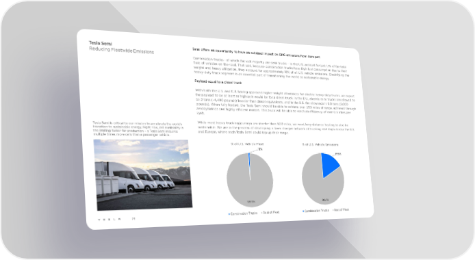 Tesla Semi Semi offers an opportunity to have an outsized impact on GHG emissions from transport Reducing Fleetwide Emissions Combination trucks –of which the vast majority are semi trucks – in the U.S. account for just 1.1% of the total fleet of vehicles on the road. That said, because combination trucks have high fuel consumption due to their weight and heavy utilization, they account for approximately 18% of all U.S. vehicle emissions. Electrifying the heavy-duty truck segment is an essential part of transitioning the world to sustainable energy. Payload equal to a diesel truck With both the U.S. and E.U. having approved higher weight allowances for electric heavy-duty trucks, we expect the payload to be at least as high as it would be for a diesel truck. In the E.U., electric semi trucks are allowed to be 2 tons (~4,400 pounds) heavier than diesel equivalents, and in the U.S. the allowance is 0.9 tons (2,000 pounds). When fully loaded, the Tesla Semi should be able to achieve over 500 miles of range, achieved through aerodynamics and highly efficient motors. This truck will be able to reach an efficiency of over 0.5 miles per kWh. Tesla Semi is critical to our mission to accelerate the world’s While most heavy trucking journeys are shorter than 500 miles, we want long-distance hauling to also be transition to sustainable energy. Right now, cell availability is sustainable. We are in the process of developing a Semi charger network at trucking rest stops across the U.S. the limiting factor for production – a Tesla Semi requires and Europe, where each Tesla Semi could top up their range. multiple times more cells than a passenger vehicle. % of U.S. Vehicle Fleet % of U.S. Vehicle Emissions 1.1% 17.9% 98.9% 82.1% 71 Combination Trucks Rest of Fleet Combination Trucks Rest of Fleet