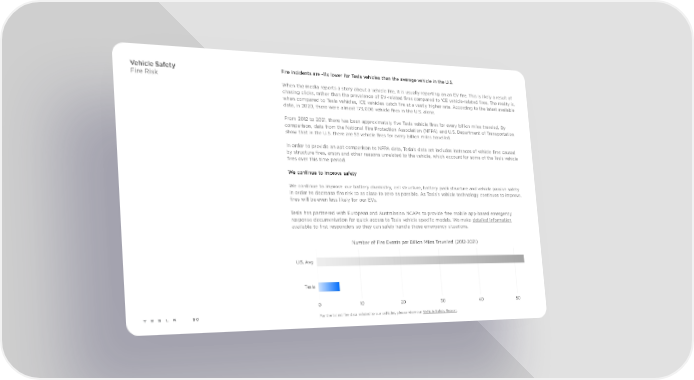 Vehicle Safety Fire incidents are ~11x lower for Tesla vehicles than the average vehicle in the U.S. Fire Risk When the media reports a story about a vehicle fire, it is usually reporting on an EV fire. This is likely a result of chasing clicks, rather than the prevalence of EV-related fires compared to ICE vehicle-related fires. The reality is, when compared to Tesla vehicles, ICE vehicles catch fire at a vastly higher rate. According to the latest available data, in 2020, there were almost 173,000 vehicle fires in the U.S. alone. From 2012 to 2021, there has been approximately five Tesla vehicle fires for every billion miles traveled. By comparison, data from the National Fire Protection Association (NFPA) and U.S. Department of Transportation show that in the U.S. there are 53 vehicle fires for every billion miles travelled. In order to provide an apt comparison to NFPA data, Tesla’s data set includes instances of vehicle fires caused by structure fires, arson and other reasons unrelated to the vehicle, which account for some of the Tesla vehicle fires over this time period. We continue to improve safety We continue to improve our battery chemistry, cell structure, battery pack structure and vehicle passive safety in order to decrease fire risk to as close to zero as possible. As Tesla’s vehicle technology continues to improve, fires will be even less likely for our EVs. Tesla has partnered with European and Australasian NCAPs to provide free mobile app-based emergency response documentation for quick access to Tesla vehicle specific models. We make detailed information available to first responders so they can safely handle those emergency situations. Number of Fire Events per Billion Miles Travelled (2012-2021) U.S. Avg Tesla 0 10 20 30 40 50 90 For the latest fire data related to our vehicles, please view our Vehicle Safety Report.