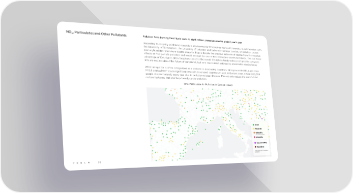 NOx, Particulates and Other Pollutants Pollution from burning fossil fuels leads to eight million premature deaths globally each year Environmental Research by Harvard University, in collaboration with According to recently published research in the University of Birmingham, the University of Leicester and University College London, air pollution causes over eight million premature deaths annually. That is double the previous estimate of deaths from the negative effects of fine-particle pollution and would account for one-in-five premature deaths worldwide. This is a major advantage of EVs that is often forgotten about as the overall EV debate tends to focus on greenhouse gases. EVs are not just about the future of our planet, but very much about addressing preventable deaths today. While air-quality is often categorized as a problem in developing countries, Nitrogen oxide (NO ) and other x PM2.5 particulates* cause significant issues in developed countries as well. In Europe alone, almost 800,000 people die prematurely every year due to pollution-related illnesses. EVs not only reduce the world's total carbon footprint, but also help to reduce city pollution. Fine Particulate Air Pollution in Europe (2022) 70