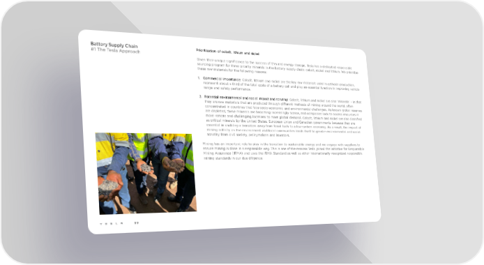 Battery Supply Chain Prioritization of cobalt, lithium and nickel #1 The Tesla Approach Given their unique significance to the success of EVs and energy storage, Tesla has a dedicated responsible sourcing program for three priority minerals in the battery supply chain: cobalt, nickel and lithium. We prioritize these raw materials for the following reasons: 1. Commercial importance: Cobalt, lithium and nickel are the key raw materials used in cathode production, represent about a third of the total costs of a battery cell and play an essential function in improving vehicle range and safety performance. 2. Potential environmental and social impact and scrutiny: Cobalt, lithium and nickel are also ‘minerals’ – in that they are raw materials that are produced through different methods of mining around the world, often concentrated in countries that face socio-economic and environmental challenges. As known global reserves are depleted, these minerals are becoming increasingly scarce, and companies look to access resources in more remote and challenging locations to meet global demand. Cobalt, lithium and nickel are also classified as critical minerals by the United States, European Union and Canadian governments because they are essential in enabling a transition away from fossil fuels to a low-carbon economy. As a result, the impact of mining activity on the environment and local communities lends itself to greater environmental and social scrutiny from civil society, policymakers and investors. Mining has an important role to play in the transition to sustainable energy and we engage with suppliers to ensure mining is done in a responsible way. This is one of the reasons Tesla joined the Initiative for Responsible Mining Assurance (IRMA) and uses the IRMA Standard as well as other internationally recognized responsible mining standards in our due diligence. 99