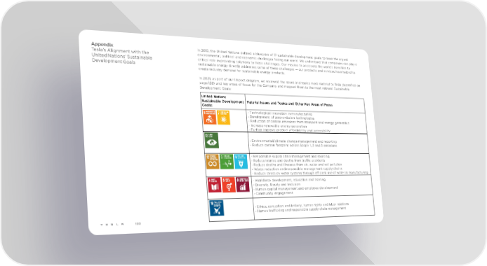 Appendix In 2015, the United Nations defined a blueprint of 17 sustainable development goals to meet the urgent Tesla’s Alignment with the environmental, political and economic challenges facing our world. We understand that companies can play a United Nations’ Sustainable critical role in providing solutions to these challenges. Our mission to accelerate the world’s transition to Development Goals sustainable energy directly addresses some of these challenges — our products and services have helped to create industry demand for sustainable energy products. In 2021, as part of our Impact program, we reviewed the issues and topics most material to Tesla (identified on page 126) and key areas of focus for the Company and mapped them to the most relevant Sustainable Development Goals: United Nations Sustainable Development Material Issues and Topics and Other Key Areas of Focus Goals: - Technological innovation in manufacturing - Development of zero-emission technologies - Reduction of carbon emissions from transport and energy generation - Increase renewable energy generation - Further improve product affordability and accessibility - Environmental/climate change management and reporting - Reduce carbon footprint across Scope 1, 2 and 3 emissions - Responsible supply chain management and sourcing - Reduce injuries and deaths from traffic accidents - Reduce deaths and illnesses from air, water and soil pollution - Waste reduction and responsible management supply chains - Reduce stress on water systems through efficient use of water in manufacturing - Workforce development, education and training - Diversity, Equity and Inclusion - Human capital management and employee development - Community engagement - Ethics, corruption and bribery, human rights and labor relations - Human trafficking and responsible supply chain management 133