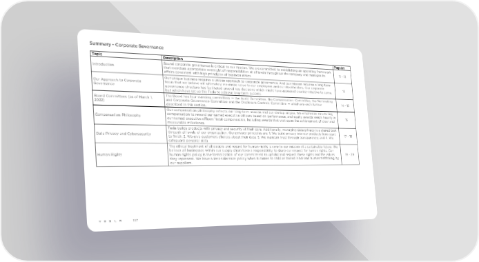 Summary –Corporate Governance Topic Description Page(s) Sound corporate governance is critical to our mission. We are committed to establishing an operating framework Introduction that exercises appropriate oversight of responsibilities at all levels throughout the company and manages its 11 - 12 affairs consistent with high principles of business ethics. Our unique business requires a unique approach to corporate governance. And our mission requires a long-term Our Approach to Corporate focus that we believe will ultimately maximize value to our employees and our stockholders. Our corporate 13 Governance governance structure has facilitated several key decisions which might have appeared counter-intuitive to some, but which have set up the Tesla to achieve long-term success. Board Committees (as of March 1, The Board has four standing committees — the Audit Committee, the Compensation Committee, the Nominating 2022) and Corporate Governance Committee and the Disclosure Controls Committee — which are each further 14 - 15 described in this section. Our compensation philosophy reflects our long-term mission and our startup origins. We emphasize structuring Compensation Philosophy compensation to reward our named executive officers based on performance, and equity awards weigh heavily in 16 our named executive officers’ total compensation, including awards that vest upon the achievement of clear and measurable milestones. Tesla builds products with privacy and security at their core. Additionally, managing data privacy is a shared task Data Privacy and Cybersecurity through all levels of our organization. Our privacy principles are: 1. We build privacy into our products from start 17 - 18 to finish; 2. We give customers choices about their data; 3. We maintain trust through transparency; and 4. We safeguard personal data. Theethical treatment of all people and regard for human rights is core to our mission of a sustainable future. We believe all businesses within our supply chain have a responsibility to share our respect for human rights. Our Human Rights human rights policy is the formalization of our commitment to uphold and respect these rights and the values 19 - 20 they represent. We have a zero-tolerance policy when it comes to child or forced labor and human trafficking by our suppliers. 117