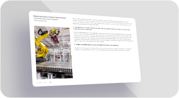 Reducing Carbon Footprint Even Further We will not be content until all our factories are carbon neutral, and there are other projects that we are Tesla Manufacturing Footprint: working on to further reduce emissions. In order to reduce the cost of our vehicles and batteries, we also need Upcoming Plans to use less energy to produce them. Many of the projects created to achieve this goal were showcased at our Battery Day presentation in September 2020. 4. Transitioning to in-house manufactured 4680 Tesla cells, whose production process can reduce energy consumption by more than 70% At Tesla’s 2020 Battery Day, we presented a novel way that cells can be manufactured using a dry electrode process. Current electrode production processes involve mixing liquids with cathode or anode powders and using massive machinery to coat and dry the electrode. Since this process involves large ovens, today’s cell production consumes a lot of energy. The new dry-electrode process allows for the direct transition from a cathode or anode powder to an electrode film, reducing energy consumption in the overall cell manufacturing phase by more than 70% based on our latest analysis. 5. Utilizing renewable energy as much as possible throughout all our operations We plan to shift energy consumption toward renewables as quickly as possible throughout our operations, whether it is at our factories, sales, service or delivery locations or through our Supercharger network. 66