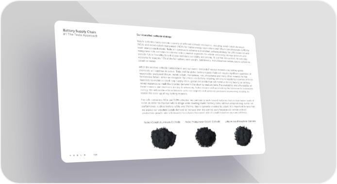 Battery Supply Chain Our diversified cathode strategy #1 The Tesla Approach Tesla’s batteries today contain a variety of different cathode chemistries, including nickel-cobalt-aluminum (NCA) and nickel-cobalt-manganese (NCM) for higher energy applications and lithium iron phosphate (LFP) for lower energy applications. Tesla will continue to advance a diversified cathode strategy for LFP, nickel-rich and manganese-rich cathodes to address various market segments for vehicle and energy storage products and provide future flexibility based on raw materials availability and pricing. To put this into context, lithium only accounts for roughly 1.5% of the full battery pack weight. Additionally, iron phosphate battery packs contain no cobalt or nickel. While the relative cathode compositions and our overall demand of various minerals and battery-grade chemicals will continue to evolve, Tesla and the global battery supply chain will require significant quantities of responsibly produced lithium, nickel, cobalt, manganese, iron, phosphates and many other minerals for the foreseeable future. While we recognize the critical role battery recycling will play in supplying a portion of these materials to enable a closed loop supply chain, global cell production will continue to rely heavily on primary, mined materials to meet the growing demand in the short to medium term. The availability and affordability of these minerals and chemicals are key to advancing Tesla’s mission and accelerating the transition to sustainable energy. We will continue to collaborate with our suppliers and upstream producers in providing visibility to enable the scale up of key battery minerals. For cells containing NCA and NCM cathodes, we continue to work toward batteries that contain higher levels of nickel in order to improve vehicle range while lowering overall battery costs, without compromising overall cell performance, such as battery safety and lifetime, that is currently enabled by cobalt. It is important to note that we expect our absolute cobalt demand to increase over the coming years because our vehicle and cell production growth rate is forecasted to outpace the overall rate of cobalt reduction on a per cell basis. Nickel-Cobalt-Aluminum Cathode Nickel-Manganese-Cobalt Cathode Lithium-Iron-Phosphate Cathode P 101