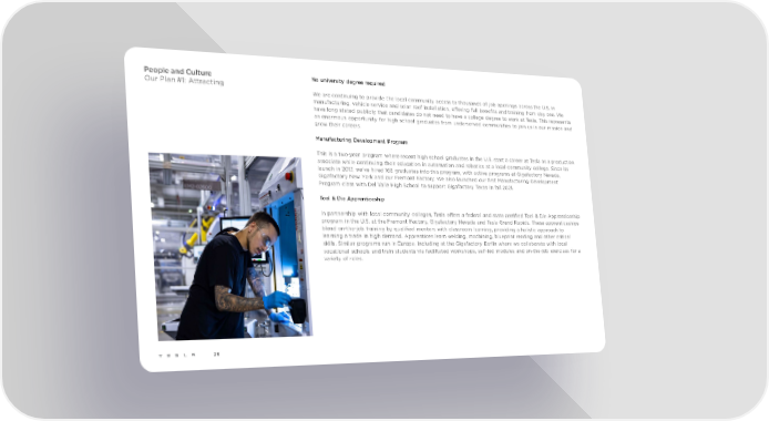 People and Culture No university degree required Our Plan #1: Attracting We are continuing to provide the local community access to thousands of job openings across the U.S. in manufacturing, vehicle service and solar roof installation, offering full benefits and training from day one. We have long stated publicly that candidates do not need to have a college degree to work at Tesla. This represents an enormous opportunity for high school graduates from underserved communities to join us in our mission and grow their careers. Manufacturing Development Program This is a two-year program where recent high school graduates in the U.S. start a career at Tesla as a production associate while continuing their education in automation and robotics at a local community college. Since its launch in 2017, we've hired 168 graduates into this program, with active programs at Gigafactory Nevada, Gigafactory New York and our Fremont Factory. We also launched our first Manufacturing Development Program class with Del Valle High School to support Gigafactory Texas in fall 2021. Tool & Die Apprenticeship In partnership with local community colleges, Tesla offers a federal and state certified Tool & Die Apprenticeship program in the U.S. at the Fremont Factory, Gigafactory Nevada and Tesla Grand Rapids. These apprenticeships blend on-the-job training by qualified mentors with classroom learning, providing a holistic approach to learning a trade in high demand. Apprentices learn welding, machining, blueprint reading and other critical skills. Similar programs run in Europe, including at the Gigafactory Berlin where we collaborate with local vocational schools and train students via facilitated workshops, self-led modules and on-the-job exercises for a variety of roles. 26