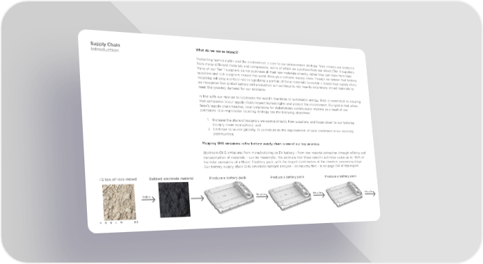 Supply Chain What do we see as impact? Introduction Protecting human rights and the environment is core to our procurement strategy. Tesla creates our products from many different materials and components, some of which we purchase from our direct (Tier 1) suppliers. Many of our Tier 1 suppliers do not purchase all their raw materials directly, rather they get them from their suppliers and sub-suppliers around the world through a complex supply chain. Though we believe that battery recycling will play a critical role in supplying a portion of these materials to enable a closed loop supply chain, we recognize that global battery cell production will continue to rely heavily on primary, mined materials to meet the growing demand for our products. In line with our mission to accelerate the world’s transition to sustainable energy, Tesla is committed to ensuring that companies in our supply chain respect human rights and protect the environment. Our goal is that where Tesla’s supply chain touches, local conditions for stakeholders continuously improve as a result of our purchases. Our responsible sourcing strategy has the following objectives: 1. Increase the share of materials we source directly from suppliers, and those closer to our factories (supply chain localization); and 2. Continue to source globally, to contribute to the improvement of local conditions in our sourcing communities. Mapping GHG emissions in the battery supply chain is one of our top priorities Upstream GHG emissions from manufacturing an EV battery – from raw material extraction through refining and transportation of materials – can be meaningful. We estimate that these specific activities cause up to ~80% of the total emissions of a Model 3 battery pack, with the largest contributors at the chemical processing stage. Our battery supply chain GHG emissions hotspot analysis – an industry first – is on page 104 of this report. ~12 ton of rock mined Refined electrode material Produce a battery pack Produce a battery pack Produce a battery pack Refine Recycle Recycle Recycle 95