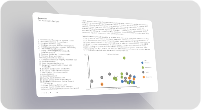Appendix In 2021, we conducted a comprehensive materiality analysis to better understand the key ESG topics that were Our Materiality Analysis most salient to our diverse group of stakeholders. To start, we identified over 40 issues in key areas that could directly or indirectly impact our business. The topics ranged from economic, environmental, social and governance issues. These issues were identified from four components: (1) a competitive landscape review, (2) interviews with investors and other key external stakeholders, (3) industry reports and documented research, such as the World Economic Forum’s 2021 Global Risks Report and (4) external ESG frameworks relevant to our industry and regulatory requirements across global capital markets. Tesla’s Sustainability Council refined the list of 40 key issues into a survey containing 25 questions in an effort to help us prioritize these topics for operational management and disclosure in this year’s Impact Report. As 1. Environmental Management, Reducing Carbon part of the assessment, we surveyed our key stakeholders, asking them to rate the identified economic and ESG 2. Quality Management– Product Safety topics on a scale of 1-5, based on their perceived importance and impact to Tesla’s business. A total of 2,168 3. Employee Workplace Safety individuals from Tesla and approximately 40 external partners, including trade associations, universities, 4. Employee Attraction, Retention, Development suppliers, environmental consultants, nonprofits and local administrators, responded to the survey. 35% of 5. Ethical Business Conduct, Integrity, Transparency responses came from North America, 57% from China and 8% from Europe. Below are the top issues identified 6. Data Protection, Cybersecurity by our materiality analysis, in order of importance to survey responders. 7. Supply Chain Management, Sustainable Materials/Products Tesla Materiality Matrix 8. Customer Satisfaction, Trust and Loyalty Higher 9. Company Brand and Mission 1 10. Employee Health and Wellness 11. Company’s Intellectual Property, Innovation, R&D Key: 12. Renewable Energy s 13. Waste Management/Recycling r Economic e d 14. Company Financial Health ( Product Sold, l Profitability) ho e Environment 15. Employee Compensation and Benefits k a 16. Air Quality, Reducing Toxic Emissions t 17. New Markets, EV, Autonomous Cars n S o Social 18. Labor Relations e 18 7 4 19. Water Management nc ue 20 3 20.Diversity, Equity and Inclusion l 23 19 13 2 nf Governance 21. Climate Change and Risk Management I 22 10 6 22.Biodiversity Preservation, Natural Resource 25 21 5 Conservation 17 15 11 16 12 8 23.Human Trafficking, Forced Labor 24 14 9 24.Critical Events, Disaster Relief, Pandemic 25.Community Engagement, Economic Development Lower Impact to Tesla Business Higher 126