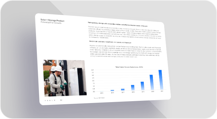 Solar + Storage Product Pairing energy storage with renewables enables cost-effective decarbonization of the grid Potential For Growth The best way to avoid blackouts is to reduce your reliance on the grid. Tesla is a one-stop shop for taking our customers off-grid by covering a large variety of their needs. In 2021, Tesla sold 4 GWh worth of energy storage products, more than 15% of the 25 GWh global market*. Some of these projects were massive deployments, including a 371 MWh installation in California and a 497 MWh installation in Victoria, Australia. In order to switch global energy usage to renewable sources, we estimate that global annual battery storage production will need to increase to ~10,000 GWh. Residential customers: Solar Roof, solar panels and Powerwall Anyone can dramatically reduce their carbon footprint by installing Solar Roof or solar panels with Powerwall. In theory, all U.S. domestic electricity needs, as well as vehicle transportation needs, could be met by sunlight alone. Naturally, installation of such a system needs to make financial sense for the customer. In Massachusetts, for example, we estimate that an average solar and storage system pays for itself with energy cost savings within approximately 10 years. As the cost of these products continues to decline, more customers will be willing to switch to solar and storage purely due to lower overall cost. Tesla Energy Storage Deployments (GWh) 4.0 3.5 3.0 2.5 2.0 1.5 1.0 0.5 0.0 2015 2016 2017 2018 2019 2020 2021 *Source: S&P Global 92