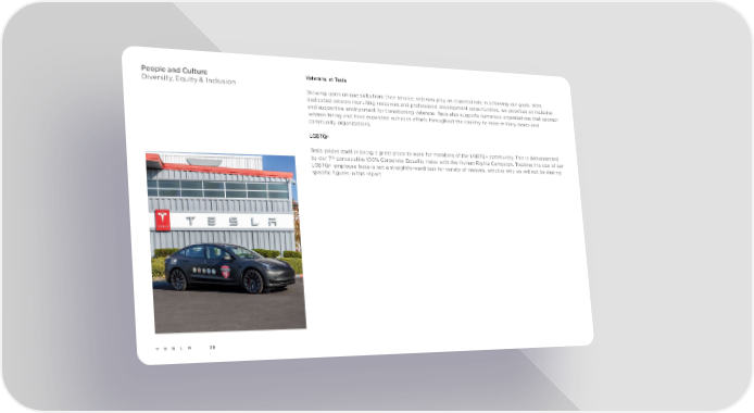 People and Culture Veterans at Tesla Diversity, Equity & Inclusion Drawing upon unique skills from their service, veterans play an essential role in achieving our goals. With dedicated veteran recruiting resources and professional development opportunities, we prioritize an inclusive and supportive environment for transitioning veterans. Tesla also supports numerous organizations that sponsor veteran hiring and have expanded outreach efforts throughout the country to more military bases and community organizations. LGBTQ+ Tesla prides itself in being a great place to work for members of the LGBTQ+ community. This is demonstrated by our 7th consecutive 100% Corporate Equality Index with the Human Rights Campaign. Tracking the size of our LGBTQ+ employee base is not a straightforward task for variety of reasons, which is why we will not be sharing specific figures in this report. 39