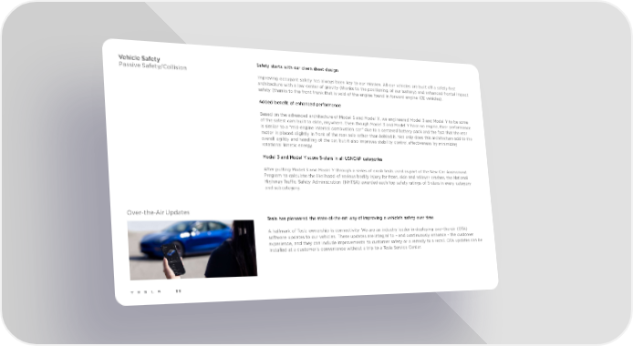 Vehicle Safety Safety starts with our clean sheet design Passive Safety/Collision Improving occupant safety has always been key to our mission. All our vehicles are built off a safety-first architecture with a low center of gravity (thanks to the positioning of our battery) and enhanced frontal impact safety (thanks to the front trunk that is void of the engine found in forward engine ICE vehicles). Added benefit of enhanced performance Based on the advanced architecture of Model S and Model X, we engineered Model 3 and Model Y to be some of the safest cars built to date, anywhere. Even though Model 3 and Model Y have no engine, their performance is similar to a “mid-engine internal combustion car” due to a centered battery pack and the fact that the rear motor is placed slightly in front of the rear axle rather than behind it. Not only does this architecture add to the overall agility and handling of the car, but it also improves stability control effectiveness by minimizing rotational kinetic energy. Model 3 and Model Y score 5-stars in all USNCAP categories After putting Model 3 and Model Y through a series of crash tests used as part of the New Car Assessment Program to calculate the likelihood of serious bodily injury for front, side and rollover crashes, the National Highway Traffic Safety Administration (NHTSA) awarded each top safety ratings of 5-stars in every category and subcategory. Over-the-Air Updates Tesla has pioneered the state-of-the-art way of improving a vehicle’s safety over time A hallmark of Tesla ownership is connectivity. We are an industry leader in deploying over-the-air (OTA) software updates to our vehicles. These updates are integral to – and continuously enhance – the customer experience, and they can include improvements to customer safety or a remedy to a recall. OTA updates can be installed at a customer’s convenience without a trip to a Tesla Service Center. 88