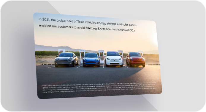In 2021, the global fleet of Tesla vehicles, energy storage and solar panels enabled our customers to avoid emitting 8.4 million metric tons of CO2e The 6.8 million metric tons of vehicle CO e savings estimate is based on the net CO e savings during the use-phase of a Tesla vehicle compared to an ICE vehicle with a real-world fuel economy of 2 2 ~24 mpg (of which 0.9 million metric tons was avoided through annual renewables matching for the global Supercharger network and home charging in California). The 1.6 million metric tons of solar + storage CO2e savings estimate is based on CO2e avoided through generation of zero-emission electricity from Tesla solar panels, including energy stored and later dispatched from our energy storage products. Geographic distribution of our deliveries (both vehicle and solar), grid mix at the country, state and province level and upstream emissions are reflected in these figures. 3