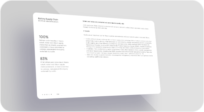 Battery Supply Chain Collect and review environmental and social data to identify risks #2 Risk Identification In the past year, Tesla collected environmental and social data in its cobalt, lithium and nickel supply chains through the following main activities: 2.1 Audits Audits are an important tool for Tesla to gather environmental and social data for cobalt, nickel and lithium. 100% • In 2021, 83% of refiners and mine sites in Tesla’s supply chain, including 100% of refiners and mine sites from Refiners and mine sites in Tesla’s whom Tesla sources directly, either underwent or committed to undergo independent external sustainability cobalt, nickel and lithium supply audits against one of the following sustainability and responsible mining standards: IRMA Standard, the chains that we directly sourced from Responsible Minerals Initiative (RMI) Responsible Minerals Assurance Process (RMAP), Towards Sustainable underwent or have committed to Mining (TSM) and/or the International Council on Mining and Metals (ICMM) Performance Expectations. undergo independent third-party • In addition, Tesla conducted six audits in the battery supply chain tailored to Tesla’s specific environmental and social requirements, including the OECD guidance and environmental management systems. Tesla also sustainability audits has an audit program that goes beyond the battery supply chain – please see pages 112 - 115. • Tesla also reviews suppliers’ ISO14001 (environmental management) and OHSAS 18001 (occupational health 83% and safety) certification statuses. Of all refiners and mine sites in Tesla’s cobalt, nickel and lithium supply chains underwent, or have committed to undergo, independent third-party sustainability audits 102