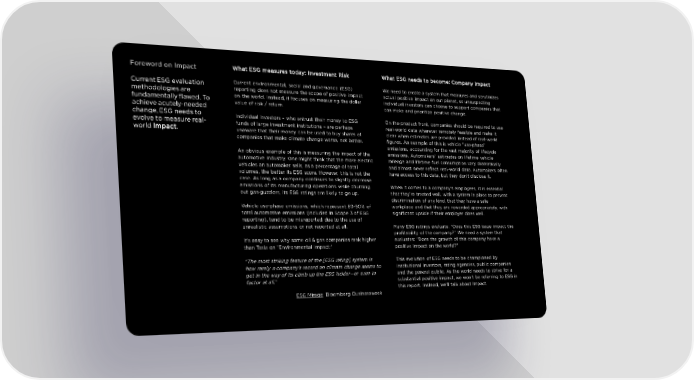 Foreword on Impact What ESG measures today: Investment Risk What ESG needs to become: Company Impact Current ESGevaluation Current environmental, social and governance (ESG) We need to create a system that measures and scrutinizes methodologies are reporting does not measure the scope of positive impact actual positive impact on our planet, so unsuspecting fundamentally flawed. To on the world. Instead, it focuses on measuring the dollar individual investors can choose to support companies that achieve acutely-needed value of risk / return. can make and prioritize positive change. change, ESG needs to Individual investors – who entrust their money to ESG On the product front, companies should be required to use evolve to measure real- funds of large investment institutions – are perhaps real-world data wherever remotely feasible and make it world Impact. unaware that their money can be used to buy shares of clear when estimates are provided instead of real-world companies that make climate change worse, not better. figures. An example of this is vehicle “use-phase” emissions, accounting for the vast majority of lifecycle An obvious example of this is measuring the impact of the emissions. Automakers' estimates on lifetime vehicle automotive industry. One might think that the more electric mileage and lifetime fuel consumption vary dramatically vehicles an automaker sells, as a percentage of total and almost never reflect real-world data. Automakers often volumes, the better its ESG score. However, this is not the have access to this data, but they don’t disclose it. case. As long as a company continues to slightly decrease emissions of its manufacturing operations while churning When it comes to a company’s employees, it is essential out gas-guzzlers, its ESG ratings are likely to go up. that they’re treated well, with a system in place to prevent discrimination of any kind, that they have a safe Vehicle use-phase emissions, which represent 80-90% of workplace and that they are rewarded appropriately, with total automotive emissions (included in Scope 3 of ESG significant upside if their employer does well. reporting), tend to be misreported due to the use of unrealistic assumptions or not reported at all. Many ESG ratings evaluate: “Does this ESG issue impact the profitability of the company?” We need a system that It’s easy to see why some oil & gas companies rank higher evaluates: “Does the growth of this company have a than Tesla on “Environmental Impact.” positive impact on the world?” “The most striking feature of the [ESG rating] system is This evolution of ESG needs to be championed by how rarely a company’s record on climate change seems to institutional investors, rating agencies, public companies get in the way of its climb up the ESG ladder—or even to and the general public. As the world needs to strive for a factor at all.” substantial positive impact, we won’t be referring to ESG in this report. Instead, we’ll talk about Impact. ESG Mirage: Bloomberg Businessweek 2