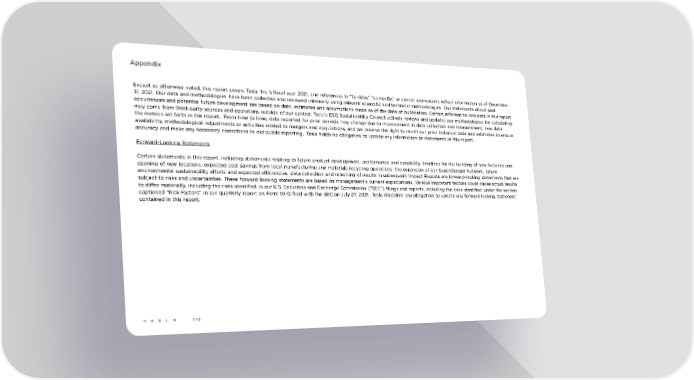 Appendix Except as otherwise noted, this report covers Tesla, Inc.’s fiscal year 2021, and references to “to date,” “currently,” or similar expressions reflect information as of December 31, 2021. Our data and methodologies have been collected and reviewed internally using relevant scientific and technical methodologies. Our statements about past occurrences and potential future development are based on data, estimates and assumptions made as of the date of publication. Certain information and data in this report may come from third-party sources and operations outside of our control. Tesla’s ESG Sustainability Council actively reviews and updates our methodologies for calculating the metrics set forth in this report. From time to time, data reported for prior periods may change due to improvement in data collection and measurement, new data availability, methodological adjustments or activities related to mergers and acquisitions, and we reserve the right to revisit our prior historical data and estimates to ensure accuracy and make any necessary corrections to our public reporting. Tesla holds no obligation to update any information or statements in this report. Forward-Looking Statements Certain statements in this report, including statements relating to future product development, performance and capability, timelines for the building of new factories and opening of new locations, expected cost savings from local manufacturing and materials recycling operations, the expansion of our Supercharger Network, future environmental sustainability efforts and expected efficiencies, data collection and reporting of results in subsequent Impact Reports are forward-looking statements that are subject to risks and uncertainties. These forward-looking statements are based on management’s current expectations. Various important factors could cause actual results to differ materially, including the risks identified in our U.S. Securities and Exchange Commission (“SEC”) filings and reports, including the risks identified under the section captioned “Risk Factors” in our quarterly report on Form 10-Q filed with the SEC on July 27, 2021 . Tesla disclaims any obligation to update any forward-looking statement contained in this report. 143