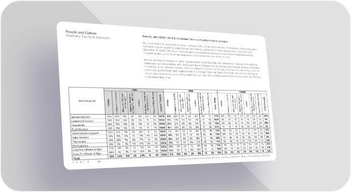 People and Culture Diversity data (EEO-1) for U.S. employees: Tesla is a majority-minority company Diversity, Equity & Inclusion We are proud to be a majority-minority company with a large representation of employees from communities that have long struggled to break through the historic roadblocks to equal opportunity in the U.S. As of December 31, 2020, 34% of our directors and vice presidents were non-white. This is a large percentage, considering that just 0.3% of our employees are director level and above at Tesla. We are working to increase minority representation in professional and management categories through our intentional recruiting efforts with Historically Black Colleges and Universities and Hispanic Serving Institutions, activations at the National Society of Black Engineers, the Society of Hispanic Engineers, AfroTech, as well as community partnerships with organizations like College Track and Black Girls Code. We are also working to ensure that the diversity in our entry-level roles will, over time and because of internal movement, be reflected in our leadership roles. Total r s Male r s Female r s o r o e o r o e a r o e in n e c in n e c in n e c a and n e ls a an d n e a an d n e e t i a t i a t i a i n a v a i n a v e i n a v a ic n a i i t a icn a i i a icn a i i al r la R r la R r la R e L f a s n at e o e L f a s n at e al e L f a s n at e m Job Categories r ic awI nd r ic aw I nd r ic aw I nd e it o A r ia I N or it o Ar ia I N or M it o Ar ia I N or h ic r e Hic s n a ll T h ic r e H ic s n a al h ic r e H ic s n a F W o m e if A a k M a W om e if A a k M t W om e if A a k M al n k v c c r n k v c c n k v c c a i a i e a i a i o a i a i t c A r as or c A r as or c A r as or p la at P e l o v p la at P e l o T p la at P e l o o is B N r m A w O is B N r m A w is B N r m A w T H O A T H O A T H O A T Service Workers 42% 30% 6% 2% 16% 0% 4% 100% 26% 20% 5% 2% 16% 0% 1% 70% 16% 10% 1% 0% 0% 0% 2% 30% Laborers & Helpers 34% 36% 16% 3% 6% 1% 5% 100% 32% 35% 15% 2% 5% 1% 5% 94% 2% 1% 1% 1% 1% 0% 1% 6% Operatives 26% 31% 15% 3% 19% 1% 5% 100% 20% 21% 11% 2% 14% 1% 3% 72% 6% 9% 4% 1% 5% 0% 2% 28% Craft Workers 40% 33% 9% 2% 11% 1% 4% 100% 40% 32% 8% 2% 10% 1% 4% 97% 1% 1% 1% 0% 0% 0% 0% 3% Administrative Support 42% 20% 7% 2% 22% 1% 5% 100% 31% 15% 5% 1% 15% 0% 4% 70% 12% 5% 2% 1% 7% 0% 2% 30% Sales Workers 52% 19% 10% 1% 12% 0% 6% 100% 38% 13% 7% 1% 8% 0% 4% 72% 14% 6% 3% 0% 3% 0% 2% 28% Technicians 46% 23% 7% 2% 17% 1% 5% 100% 42% 21% 6% 2% 15% 1% 4% 91% 4% 2% 1% 0% 2% 0% 0% 9% Professionals 48% 9% 3% 0% 37% 0% 3% 100% 39% 7% 2% 0% 27% 0% 2% 77% 9% 2% 1% 0% 10% 0% 1% 23% First/Mid Officials & Mgrs 63% 12% 5% 1% 15% 0% 4% 100% 50% 10% 4% 1% 10% 0% 3% 78% 13% 2% 1% 0% 5% 0% 1% 22% Exec/Sr. Officials & Mgrs 66% 4% 3% 0% 23% 2% 1% 100% 55% 3% 1% 0% 18% 1% 1% 79% 12% 1% 2% 0% 5% 1% 0% 21% Total 38% 24% 10% 2% 20% 1% 4% 100% 31% 19% 8% 2% 15% 1% 3% 78% 7% 5% 3% 0% 5% 0% 1% 22% 36 Tesla data are representative of calendar year 2020 – the latest available EEO-1 filing as of the publishing of this report.