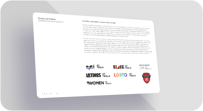 People and Culture Connecting communities to opportunities with Tesla Diversity, Equity & Inclusion During the global pandemic, we focused a great deal on expanding our community engagement and ensuring our employees stayed connected. Specifically, we expanded our Employee Resource Groups (ERGs) and ensured our programming was accessible in a remote work environment. We welcomed Asian Pacific Islanders at Tesla to our ERG family. While this was a time of uncertainty and change, through our ERGs, we ensured our employees felt more heard and connected than ever before as they pivoted to virtual events to promote inclusion across different locations, physical boundaries and time zones. At Tesla, we strive to have a diverse supply chain and create the maximum practical opportunities to provide goods and services as a part of the corporate procurement process. We formalized collaboration between the DEI, Supply Chain and Government Affairs teams to ensure local minority, women, LGBTQ+, disabled and veteran owned businesses are connected to opportunities with Tesla. We recognize that supplier diversity creates a competitive advantage for the company and has a positive impact on the global community. As the supplier diversity program develops, we will implement plans that encourage increased usage of diverse suppliers throughout our organization, partner with internal and external stakeholders to identify opportunities for diverse suppliers and work with external partners to encourage capacity building for diverse suppliers. Intersectionality 41