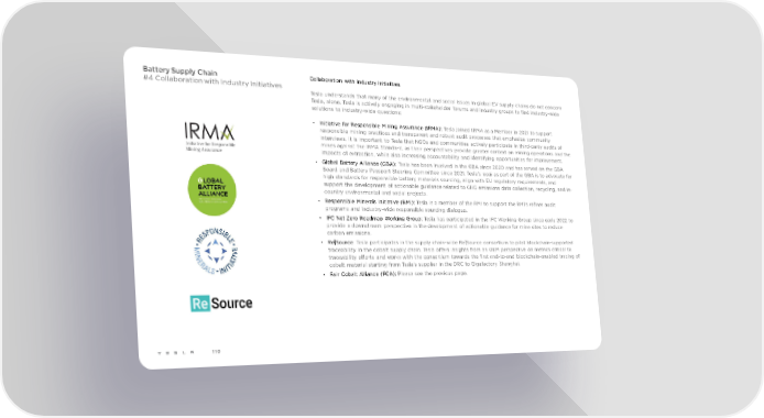 Battery Supply Chain Collaboration with industry initiatives #4 Collaboration with Industry Initiatives Tesla understands that many of the environmental and social issues in global EV supply chains do not concern Tesla, alone. Tesla is actively engaging in multi-stakeholder forums and industry groups to find industry-wide solutions to industry-wide questions: • Initiative for Responsible Mining Assurance (IRMA): Tesla joined IRMA as a Member in 2021 to support responsible mining practices and transparent and robust audit processes that emphasize community interviews. It is important to Tesla that NGOs and communities actively participate in third-party audits of mines against the IRMA Standard, as their perspectives provide greater context on mining operations and the impacts of extraction, while also increasing accountability and identifying opportunities for improvement. • Global Battery Alliance (GBA): Tesla has been involved in the GBA since 2020 and has served on the GBA Board and Battery Passport Steering Committee since 2021. Tesla’s goal as part of the GBA is to advocate for high standards for responsible battery materials sourcing, align with EU regulatory requirements, and support the development of actionable guidance related to GHG emissions data collection, recycling, and in- country environmental and social projects. • Responsible Minerals Initiative (RMI): Tesla is a member of the RMI to support the RMI’s refiner audit programs and industry-wide responsible sourcing dialogue. • IFC Net Zero Roadmap Working Group: Tesla has participated in the IFC Working Group since early 2022 to provide a downstream perspective in the development of actionable guidance for mine sites to reduce carbon emissions. • Re|Source: Tesla participates in the supply chain-wide Re|Source consortium to pilot blockchain-supported traceability in the cobalt supply chain. Tesla offers insights from an OEM perspective on metrics critical to traceability efforts and works with the consortium towards the first end-to-end blockchain-enabled tracing of cobalt material starting from Tesla’s supplier in the DRC to Gigafactory Shanghai. • Fair Cobalt Alliance (FCA): Please see the previous page. 110