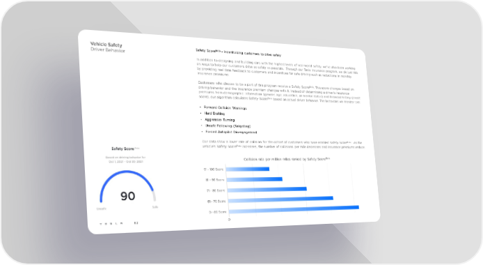 Vehicle Safety Safety ScoreBeta – Incentivizing customers to drive safely Driver Behavior In addition to designing and building cars with the highest levels of real-world safety, we've also been working on ways to help our customers drive as safely as possible. Through our Tesla Insurance program, we do just this by providing real time feedback to customers and incentives for safe driving such as reductions in monthly insurance premiums. Customers who choose to be a part of this program receive a Safety ScoreBeta. This score changes based on driving behavior and the insurance premium changes with it. Instead of determining a driver’s insurance premiums from demographic information (gender, age, education, or marital status) and financial history (credit score), our algorithm calculates Safety ScoreBeta based on actual driver behavior. The behaviors we monitor are: • Forward Collision Warnings • Hard Braking • Aggressive Turning • Unsafe Following (Tailgating) • Forced Autopilot Disengagement Our data show a lower rate of collision for the cohort of customers who have enabled Safety ScoreBeta. As the vehicle’s Safety ScoreBeta increases, the number of collisions per mile decreases and insurance premiums reduce. Collision rate per million miles ranked by Safety ScoreBeta 91 - 100 Score 81 - 90 Score 71 - 80 Score 61 - 70 Score 0 - 60 Score 82 0