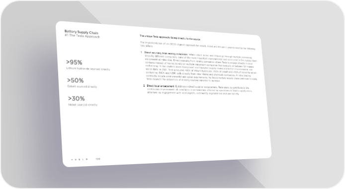 Battery Supply Chain The unique Tesla approach: Going directly to the source #1 The Tesla Approach The implementation of an OECD-aligned approach for cobalt, nickel and lithium is underpinned by the following two pillars: 1. Direct sourcing from mining companies: While cobalt, nickel and lithium go through multiple processing steps by different companies, some of the more important environmental and social risks in this supply chain are present at mine sites. Direct sourcing from mining companies allows Tesla to engage directly in local contexts instead of having to rely on multiple midstream companies that typically sit between EV makers >95% and mining. It also enables more transparent and traceable supply chains and better environmental and Lithium hydroxide sourced directly social data. In 2021, Tesla procured >95% of lithium hydroxide, >50% of cobalt and >30% of nickel for nickel- containing (NCA and NCM) cells directly from nine mining and chemicals companies. All nine binding contracts include environmental and social requirements. As Tesla’s battery supply chain continues to scale, . >50% Tesla expects the proportion of directly sourced minerals to increase Cobalt sourced directly 2. Direct local engagement: Building on direct supplier engagement, Tesla seeks to contribute to the continuous improvement of conditions in communities affected by operations in Tesla’s supply chain, informed by engagement with local experts, community organizations and civil society. >30% Nickel sourced directly 100